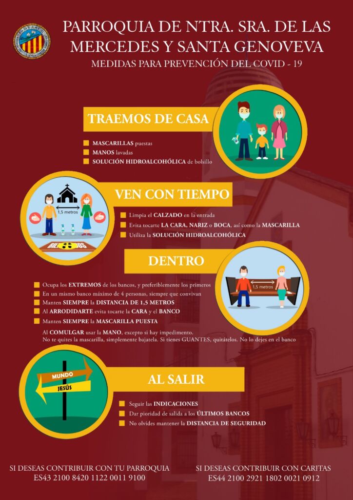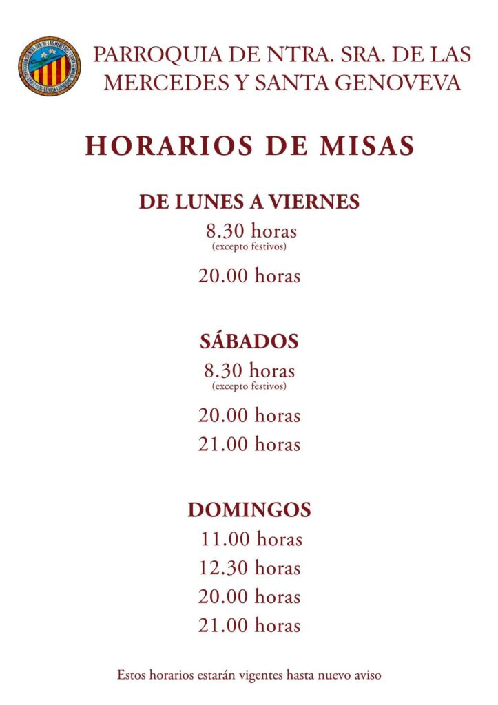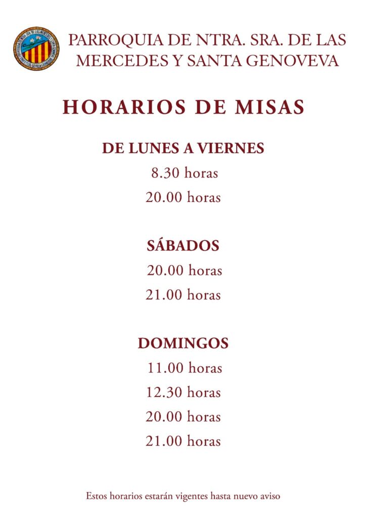 De acuerdo con el Señor Arzobispo, y con su permiso dado esta misma mañana, nuestro Templo parroquial de Nuestra Señora de las Mercedes y Santa Genoveva, se abre al culto a partir del próximo miércoles día 13 a las 8,00 h con el horario habitual y de acuerdo con las normas que ha fijado el Consejo Episcopal presidido por nuestro Arzobispo Don Juan José Asenjo Pelegrina, y que hay que tener en cuenta.