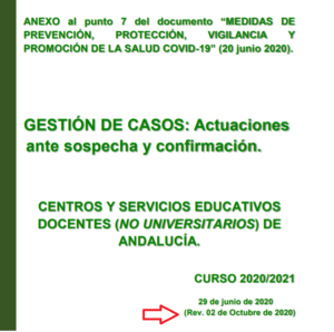 Desde la consejería de Salud y Familias de la Junta de Andalucía tenemos una revisión de la normativa que nos afecta a los centros educativos docentes (no universitarios) de Andalucía. El documento pueden descargarlo aquí: GESTIÓN DE CASOS: Actuaciones ante sospecha y confirmación. En su interior encontrarán un nuevo anexo, con fecha del 2 de Octubre, al punto 7 del Documento «MEDIDAS DE PREVENCIÓN, PROTECCIÓN, VIGILANCIA Y PROMOCIÓN DE LA SALUD COVID-19».