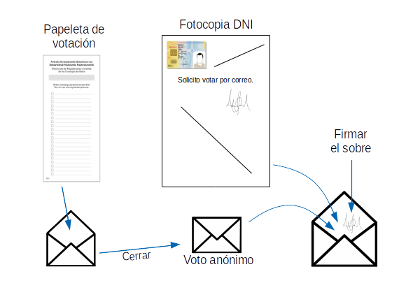 El sobre exterior contendrá firma manuscrita y coincidente con la que aparece en el documento de Identificación que aporte, fotocopia del DNI o de otro documento acreditativo equivalente, y un segundo sobre en blanco y cerrado en cuyo interior se habrá incluido la papeleta de voto MARCANDO HASTA UN MÁXIMO DE 3 CANDIDATOS (modelo de papeleta aprobado por la Junta Electoral).