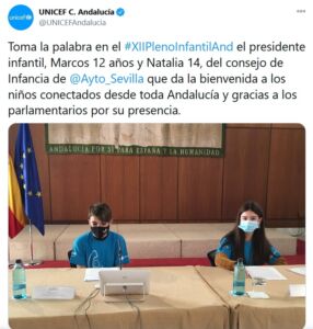 Queríamos compartir con vosotros el trabajo y dedicación de un grupo de personas entre las que queremos destacar a nuestro querido alumno Marcos, actualmente cursando Primero de E.S.O., y cuya labor se ha visibilizado estos días en los medios de comunicación gracias a la celebración del XII Pleno de la Infancia. El Pleno se ha celebrado en el parlamento de Andalucía.