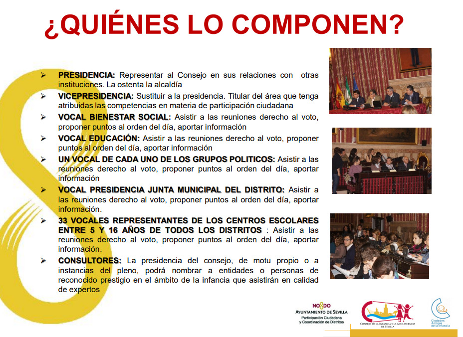 Desde la etapa de primaria, alumnos de nuestro centro han participado activamente demostrando su compromiso social a través del órgano de participación activa denominado CONSEJO MUNICIPAL DE LA INFANCIA Y LA ADOLESCENCIA. Dicho órgano pretende, entre otras cosas, presentar iniciativas y formular recomendaciones en relación con planes o programas municipales y elevarlas al Ayuntamiento de Sevilla.